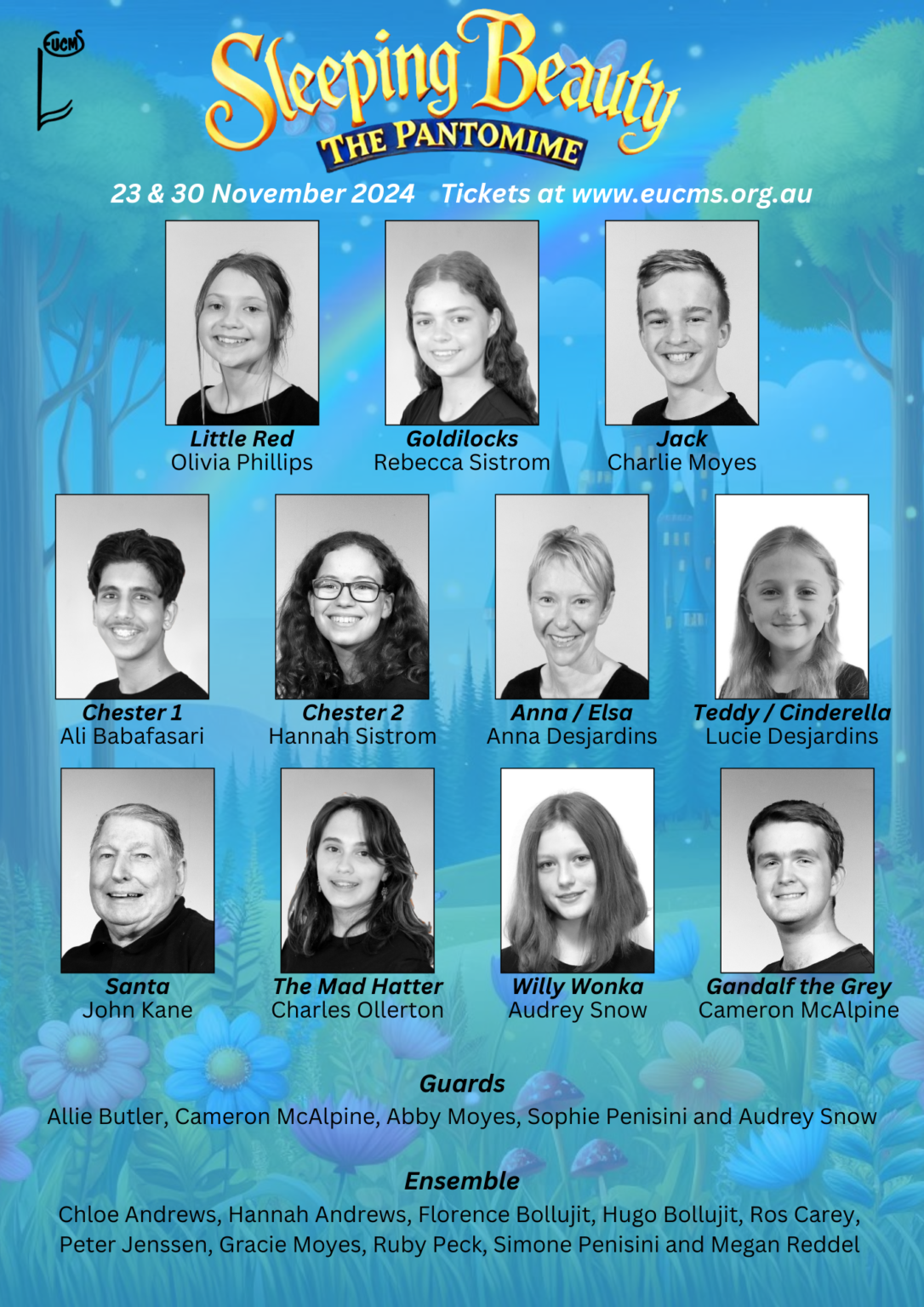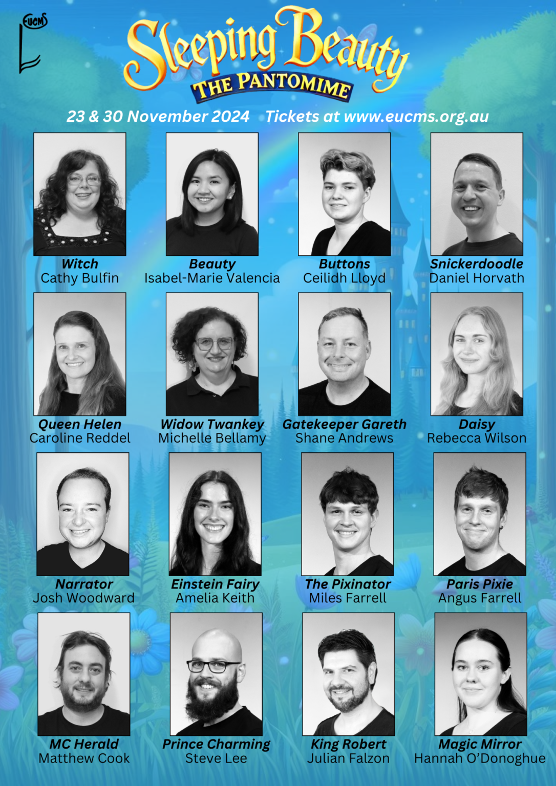 The Classic Tale of Sleeping Beauty mixed with the madness of Pantomime! In this story the Witch isn’t invited to a party, so she curses the Princess to fall into eternal sleep. The Fairies, Prince Charming and the Palace Gardener have to rescue the Princess before it is too late. Mix this with modern songs, audience interaction and hilarious jokes and you’ve got yourself Sleeping Beauty the Pantomime! This show is a new work, specifically written for EUCMS in 2024, so the characters, scenes and plot are all totally original, never before staged.